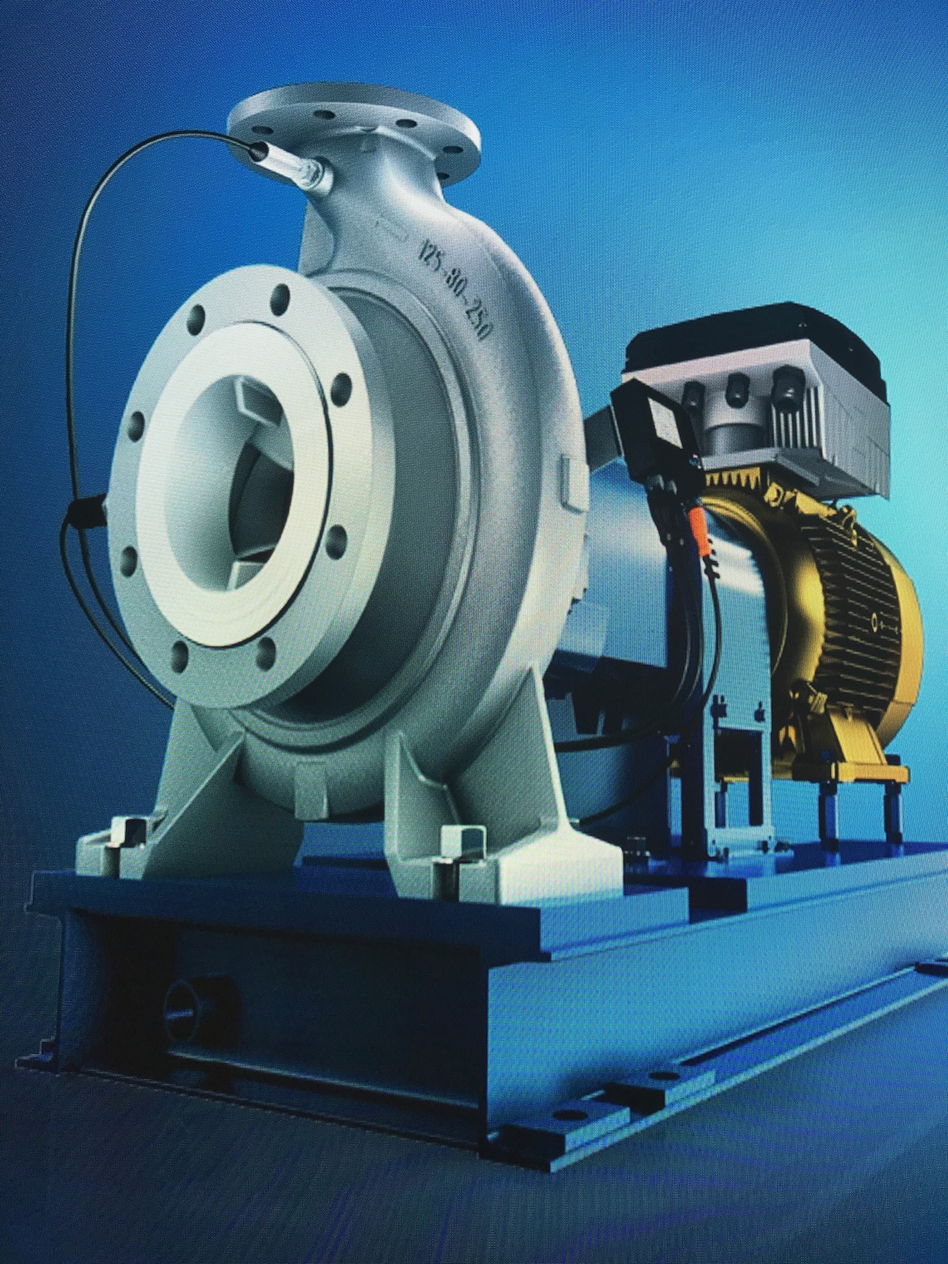 如圖所示,帶自動監(jiān)測系統(tǒng)的泵組,由水泵、電機(jī)、公用底座,壓力傳感器(進(jìn)口、出口)、流量傳感器(裝在客戶管路上)、水泵軸承溫度傳感器、機(jī)組振動傳感器、數(shù)據(jù)采集箱等零部件構(gòu)成。